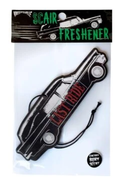 Drown out the corpse smell in your car with this haunting hearse air freshener, possessed with LAST RIDE text in blood-red font! Summon sinfully delicious smells in your car with the Cherry Burn scent. Complete with a hanging loop for easy mounting.