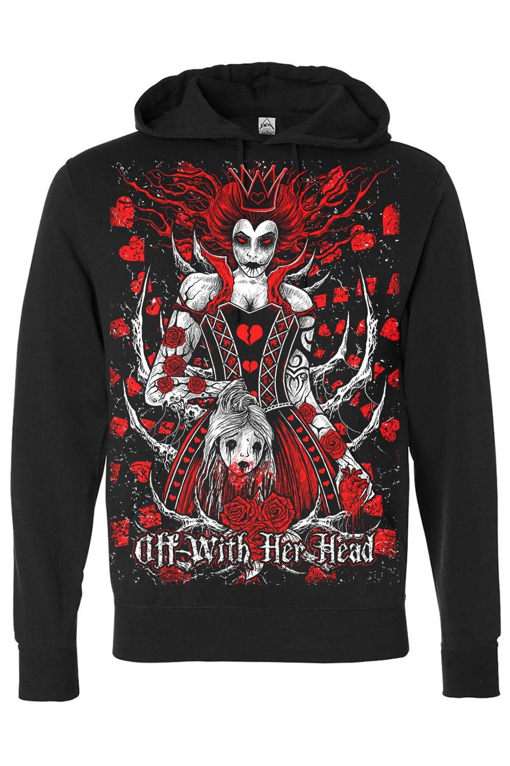 Fall down the rabbit hole, but don’t lose your head. This gory, goth hoodie features the Queen of Hearts holding Alice’s decapitated head in one hand, and her still-beating heart in the other. With hair that twists into gnarled tree branches, blood-red eyes, and card suits all around, the Queen of Hearts has at last claimed her revenge on Alice in Wonderland.