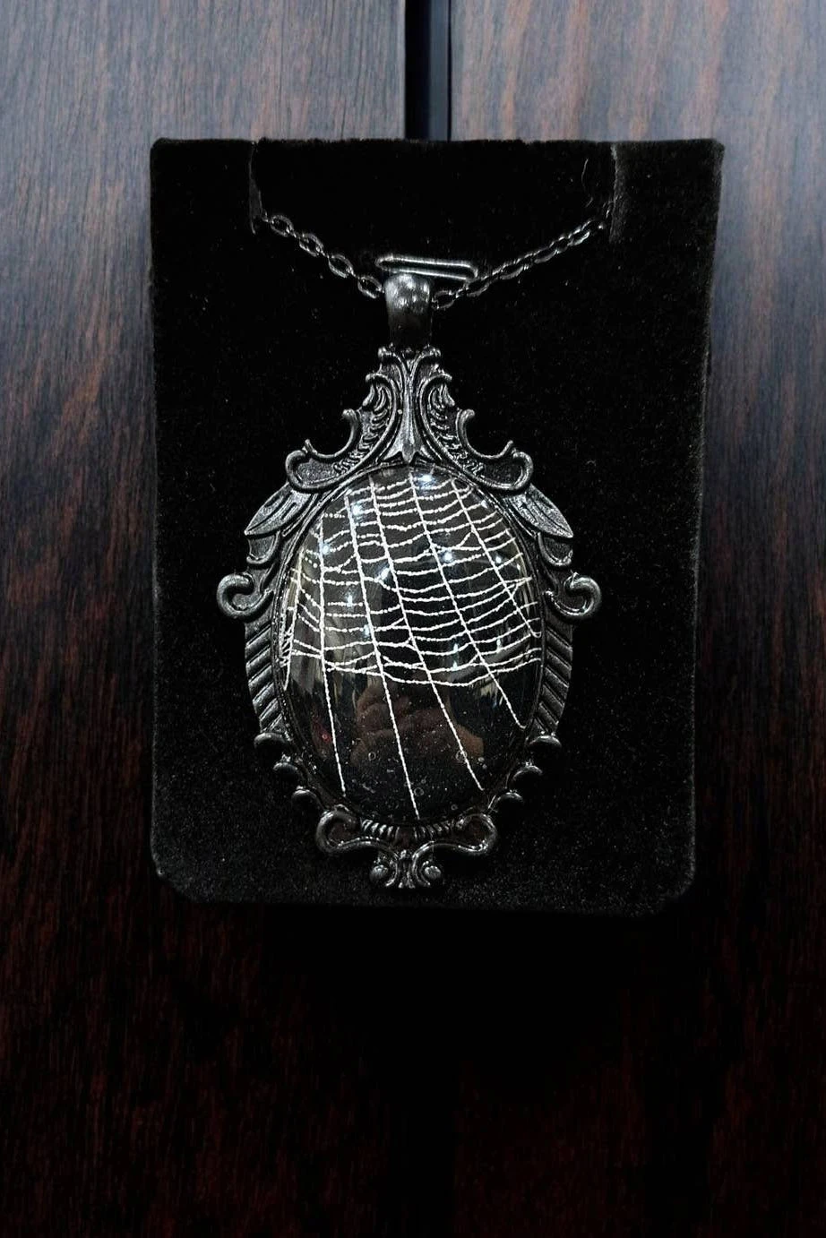 *This piece symbolizes our love of nature and connection to the darker things in the world. Each necklace comes with one, real ethically-sourced spiderweb hand-set into a black bezel. No animals are harmed in the making. Each cobweb pattern will be unique, and is hand-selected to ensure quality.